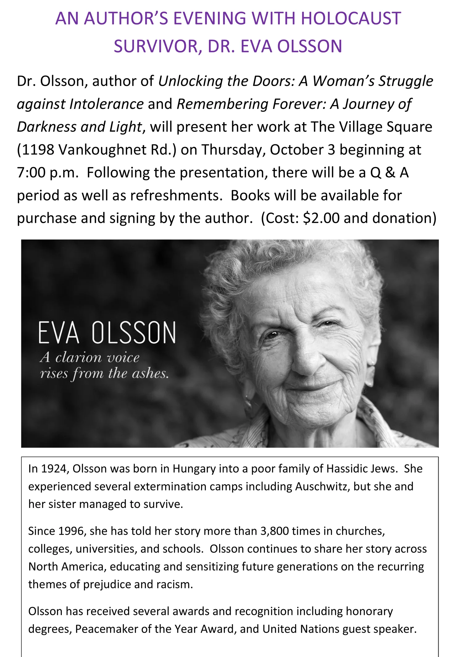 September 05, 2019 Oct 3rd 7pm Author's Evening with Holocaust Survivor, Dr. Eva Olsson September 05, 2019/ Carolyn Dunn Rapson